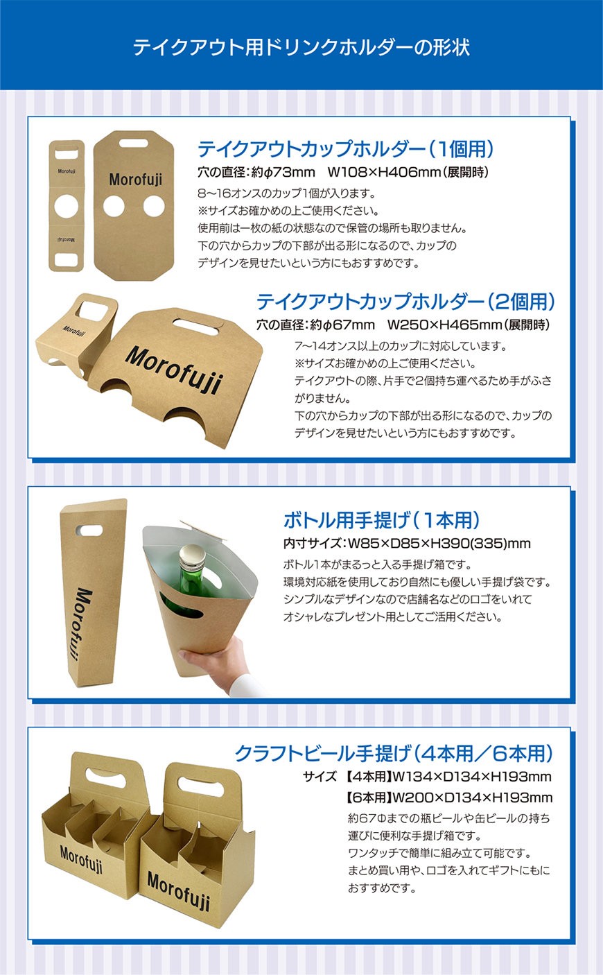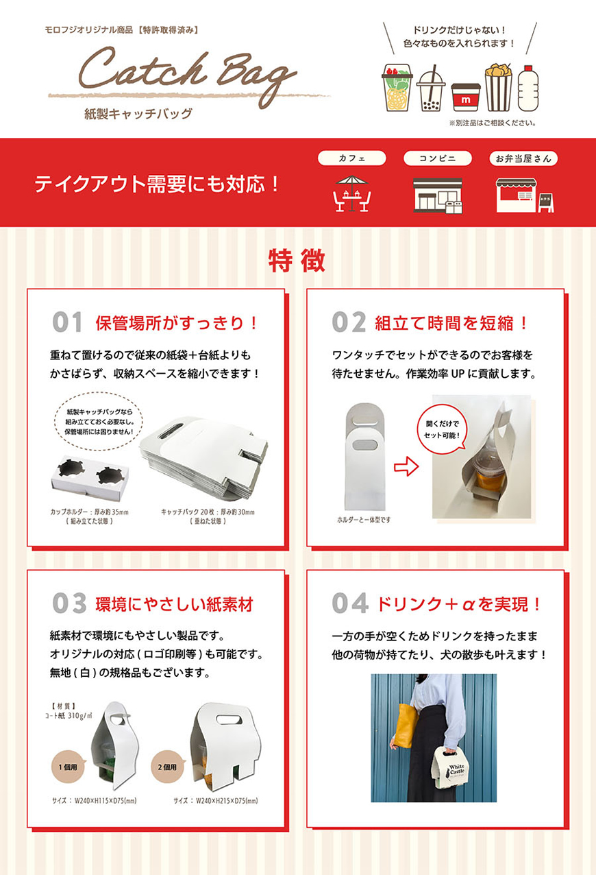ドリンクお持ち帰り用の袋とカップホルダーが一体になった当社オリジナル商品「キャッチバッグ」を紙製にした商品。